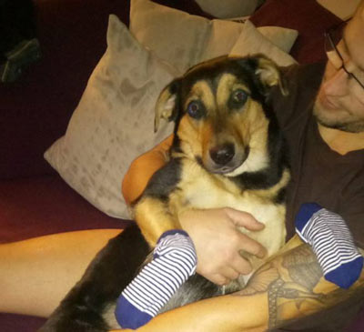 Ich habe Lucy das SchwarzApfel Hautöl am Abend zum ersten Mal auf die Ballen gegeben, ihr dann für ca. 5 min. Socken angezogen, sodass das Öl noch etwas Einziehen kann.