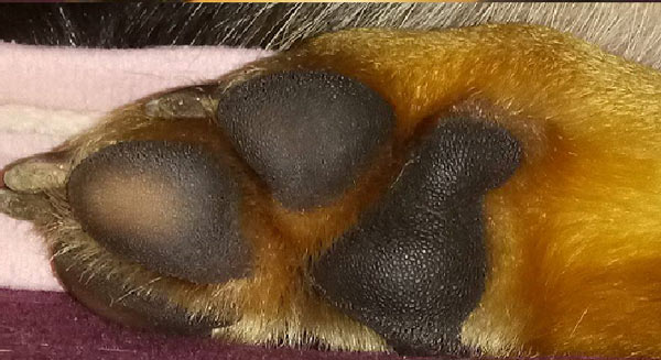 Lucy ist einen Felsen runter gerutscht und die schwarze Schutzhaut an den Ballen ist wie weggeschliffen. Da schimmert jetzt rosa Haut durch.